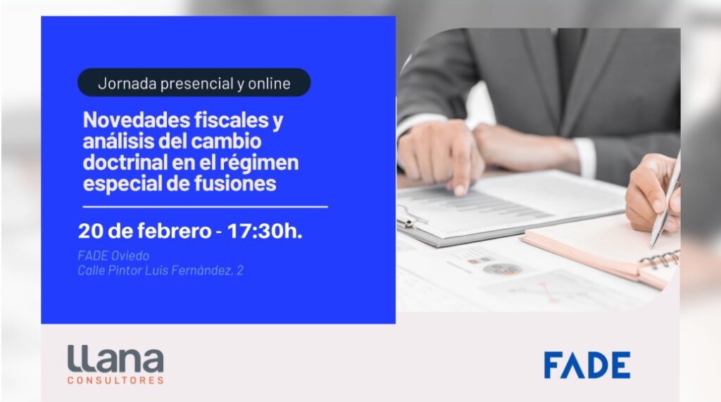 La Federación Asturiana de Empresarios y Llana Consultores organizan el próximo 20 de febrero a las 17:30 la jornada “Novedades fiscales y análisis del cambio doctrinal en el régimen especial de fusiones”, que se celebrará en la sede de FADE en Oviedo. También se puede asistir online. Ante las recientes novedades fiscales que deben considerar las empresas […]