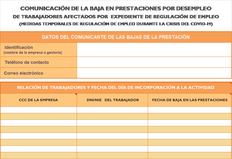 La empresa o su gestoría deben comunicar las bajas de las prestaciones de los trabajadores y trabajadoras afectados por la medida de suspensión o de reducción de jornada. Los trabajadores, al conocer la fecha en que retornan a su actividad laboral, entienden que su prestación queda interrumpida desde ese momento y no tendrán que realizar ninguna gestión directamente ante el SEPE a estos efectos.