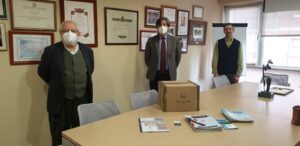 En la foto Alfonso Fernández, socio de Llana Consultores, hace entrega del lote de mascarillas a D. José Antonio García Santaclara, fundador y Presidente del Patronato y a D. Pablo Puente, director de la Fundación Siloé.
